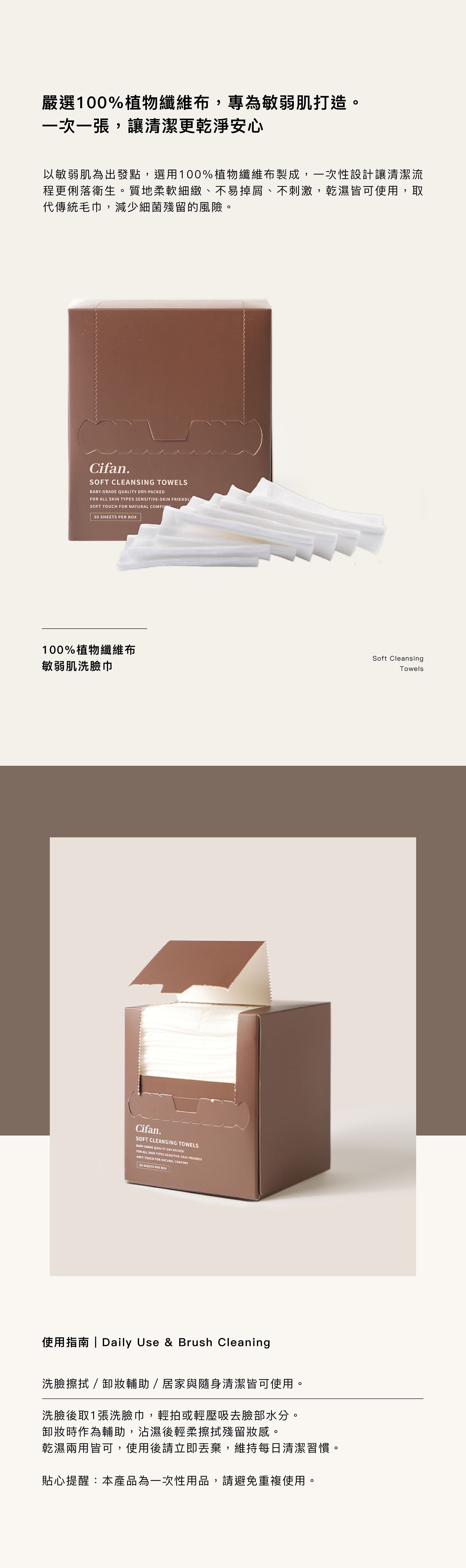 嚴選 100%植物纖維布,一次性設計乾淨衛生,專為敏弱肌打造。