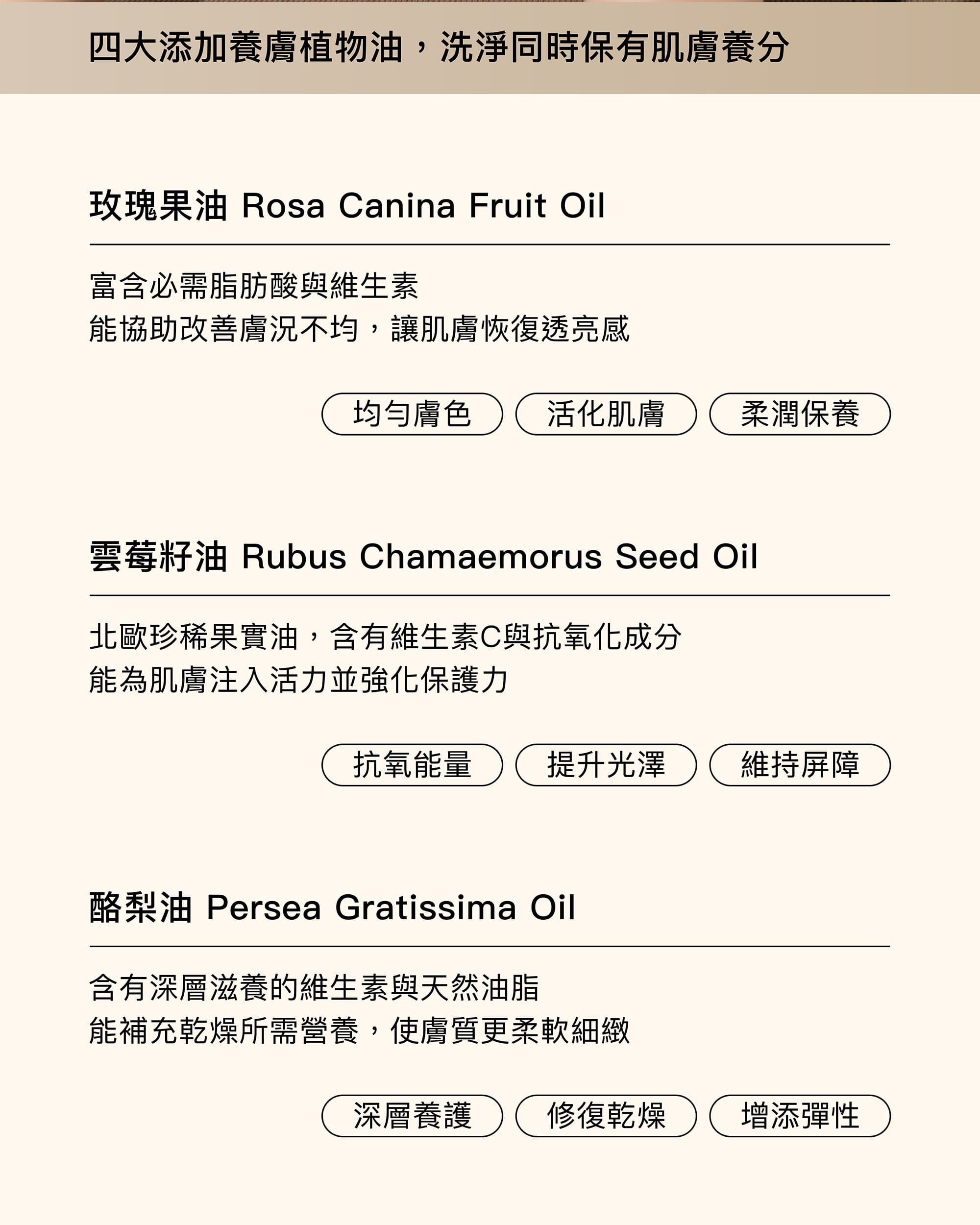 • 玫瑰果油|富含Omega-3強化肌膚屏障,適合乾燥肌膚