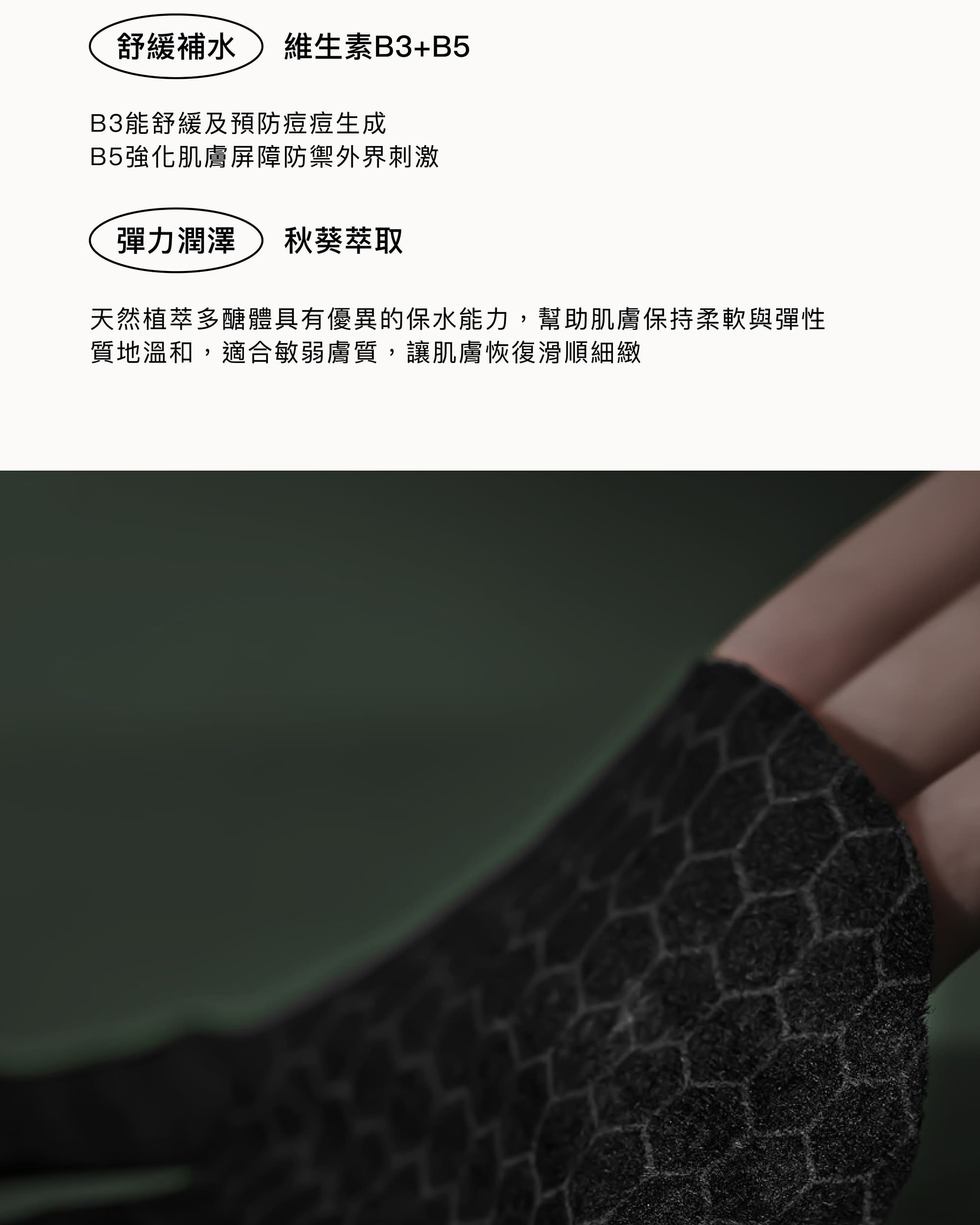 • 維他命B3+B5|舒緩修護,補水同時穩膚