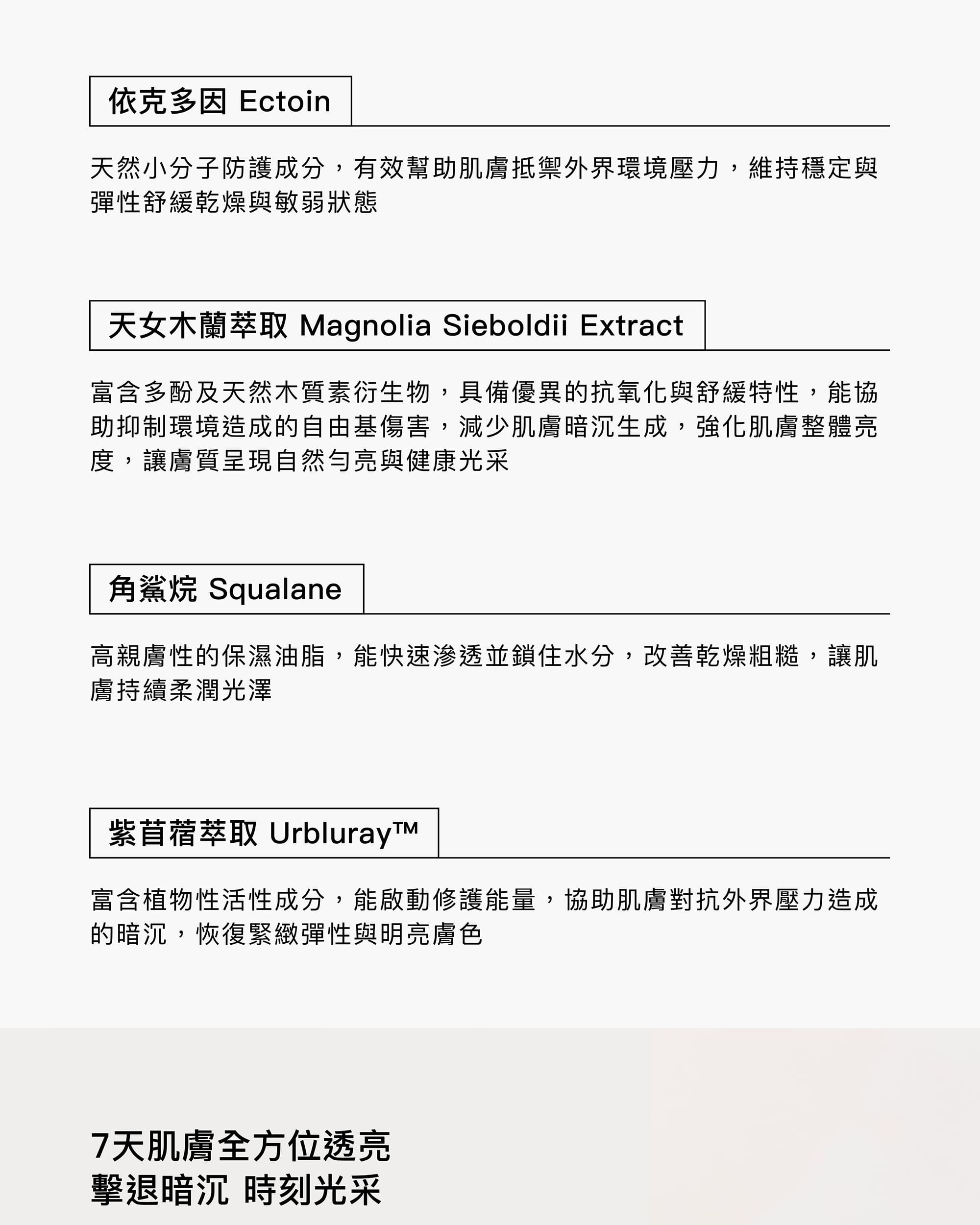• 天女木蘭萃取|天然亮白成分,改善膚色不均、提升透亮感